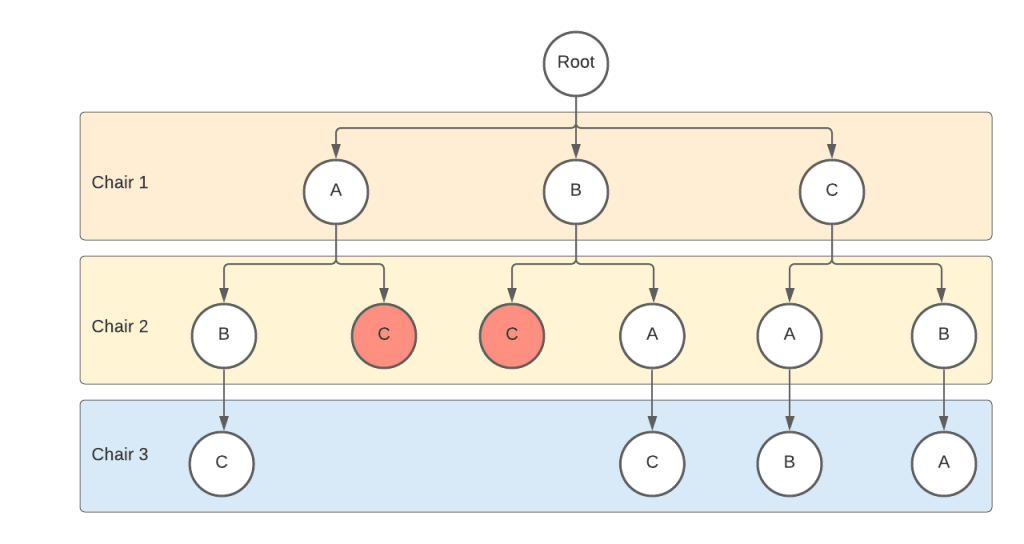 - Check if C is sitting on the second chair.